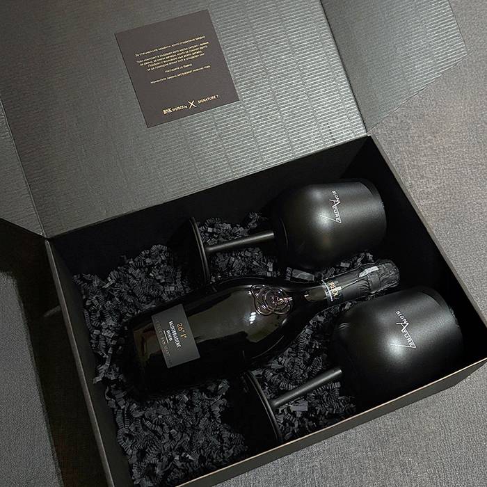 Комплектът е реализиран в колаборация със Signature 7 и включва две дизайнерски чаши от неръждаема стомана с матово черно покритие. Създадени да подчертаят аромата и структурата на виното, те превръщат всяка дегустация в малък ритуал, изпълнен със стил и внимание към детайла.