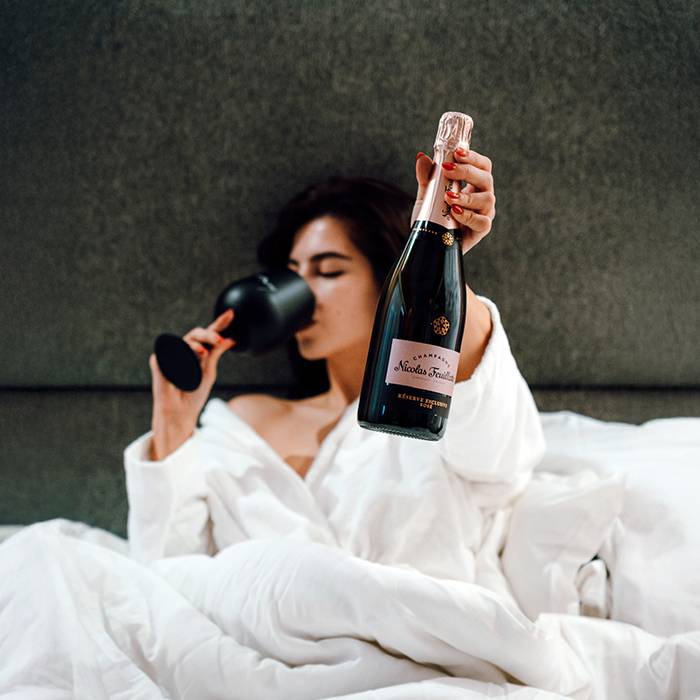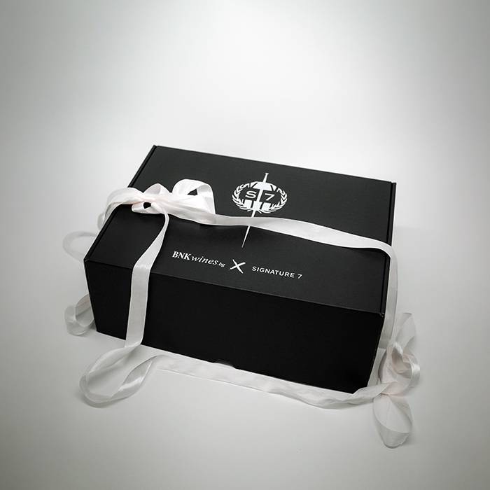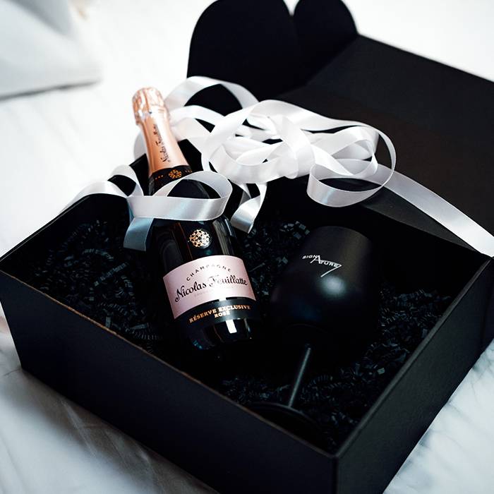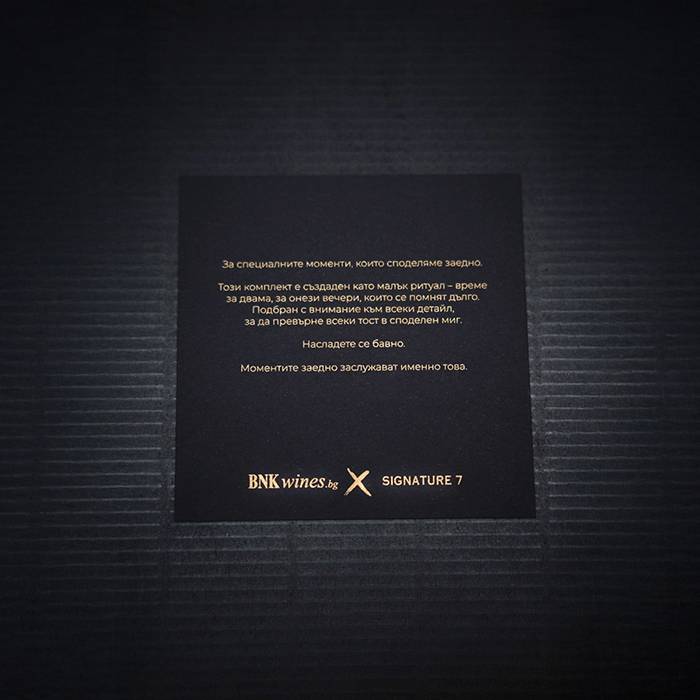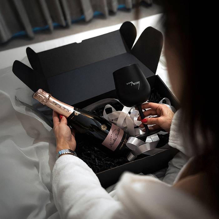 Комплектът е реализиран в колаборация със Signature 7 и включва две дизайнерски чаши от неръждаема стомана с матово черно покритие. Създадени да подчертаят аромата и характера на виното, те позволяват на шампанското да разгърне пълния си потенциал, превръщайки дегустацията в истински ритуал.